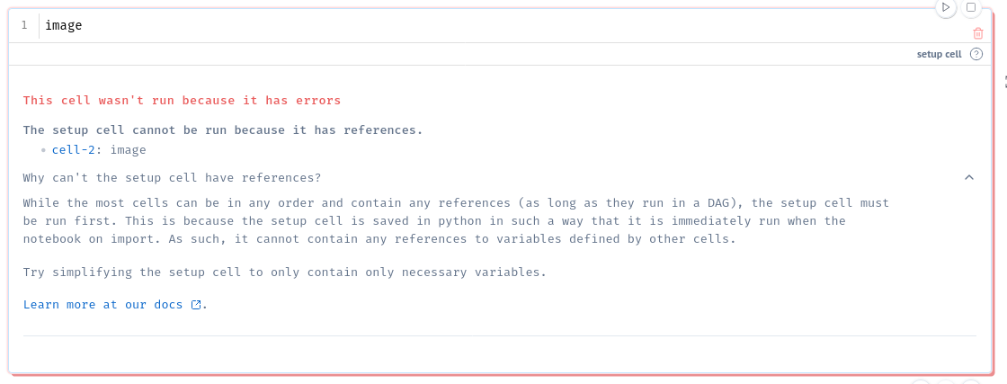 marimo raises this error when the setup cell references variables defined in other cells. In the example above, image is defined elsewhere in the notebook, and hence cannot be referenced.